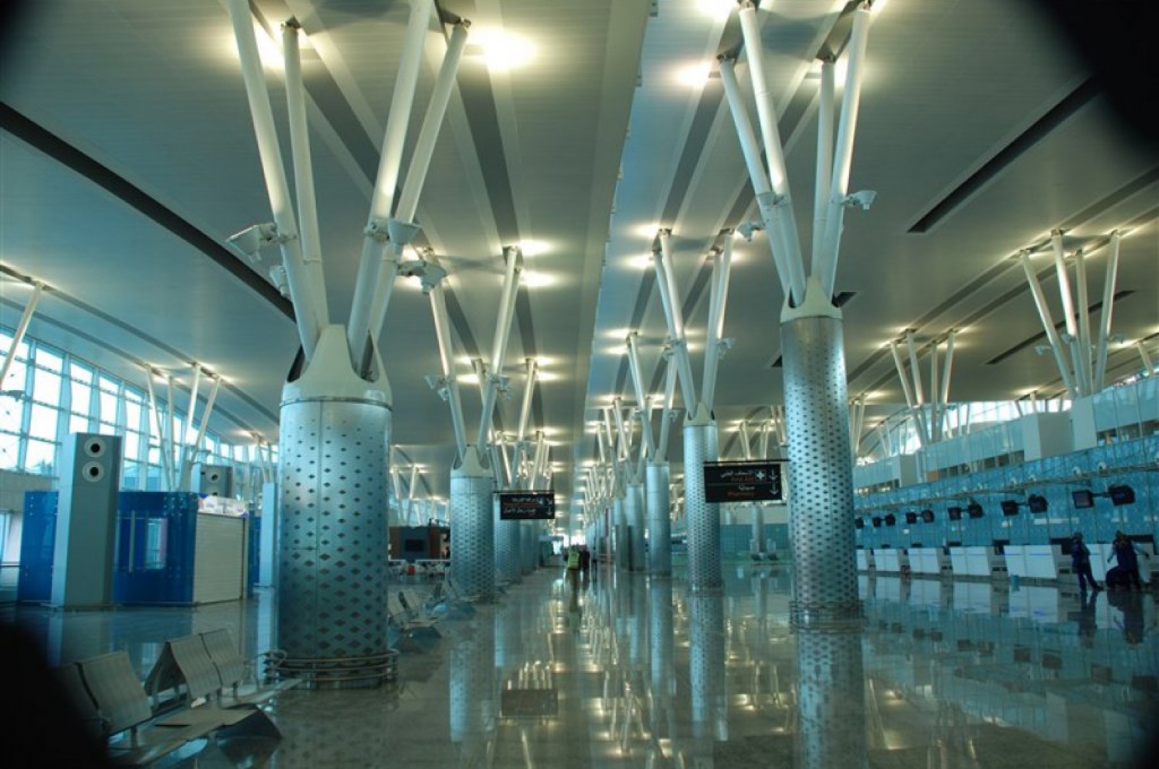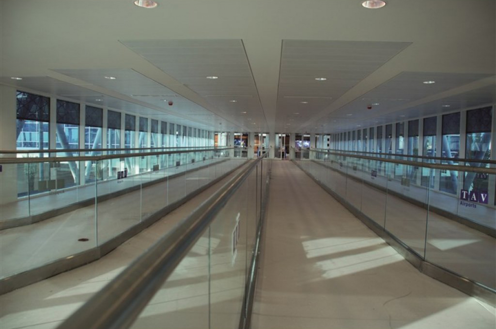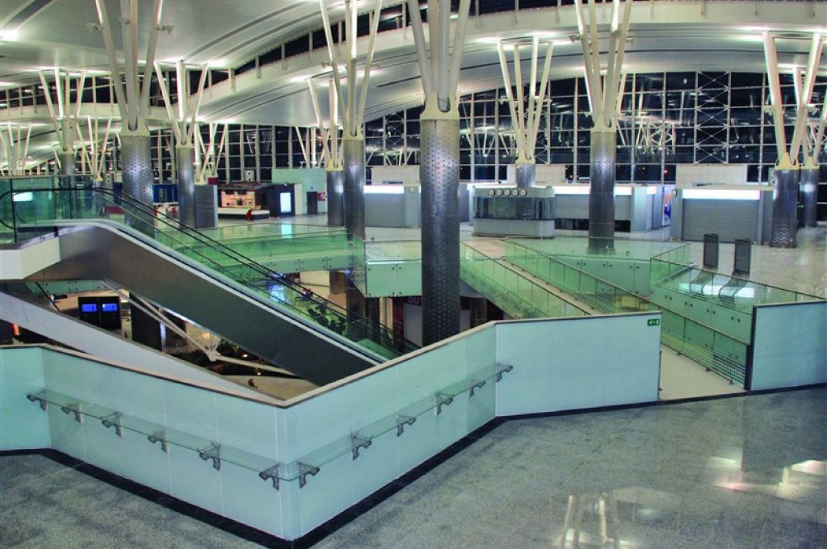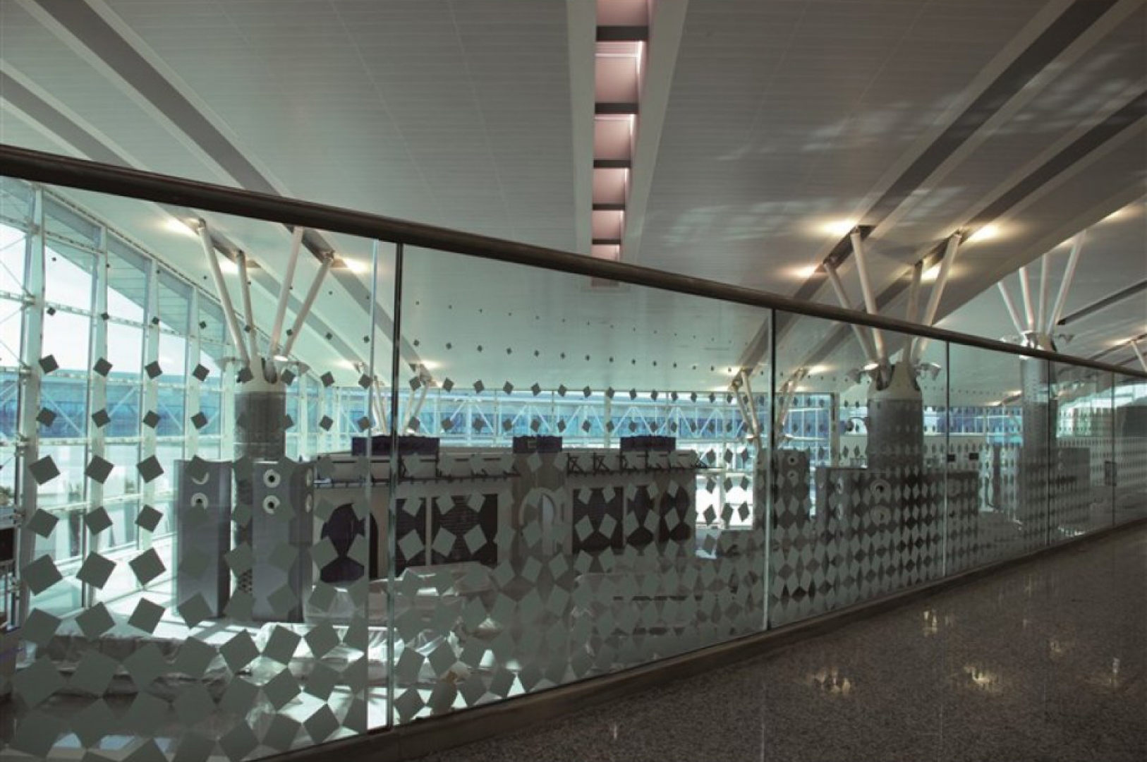 ▷ Custom-patterned glass railings with stainless steel flat bar posts applied throughout the interior areas of the airport.