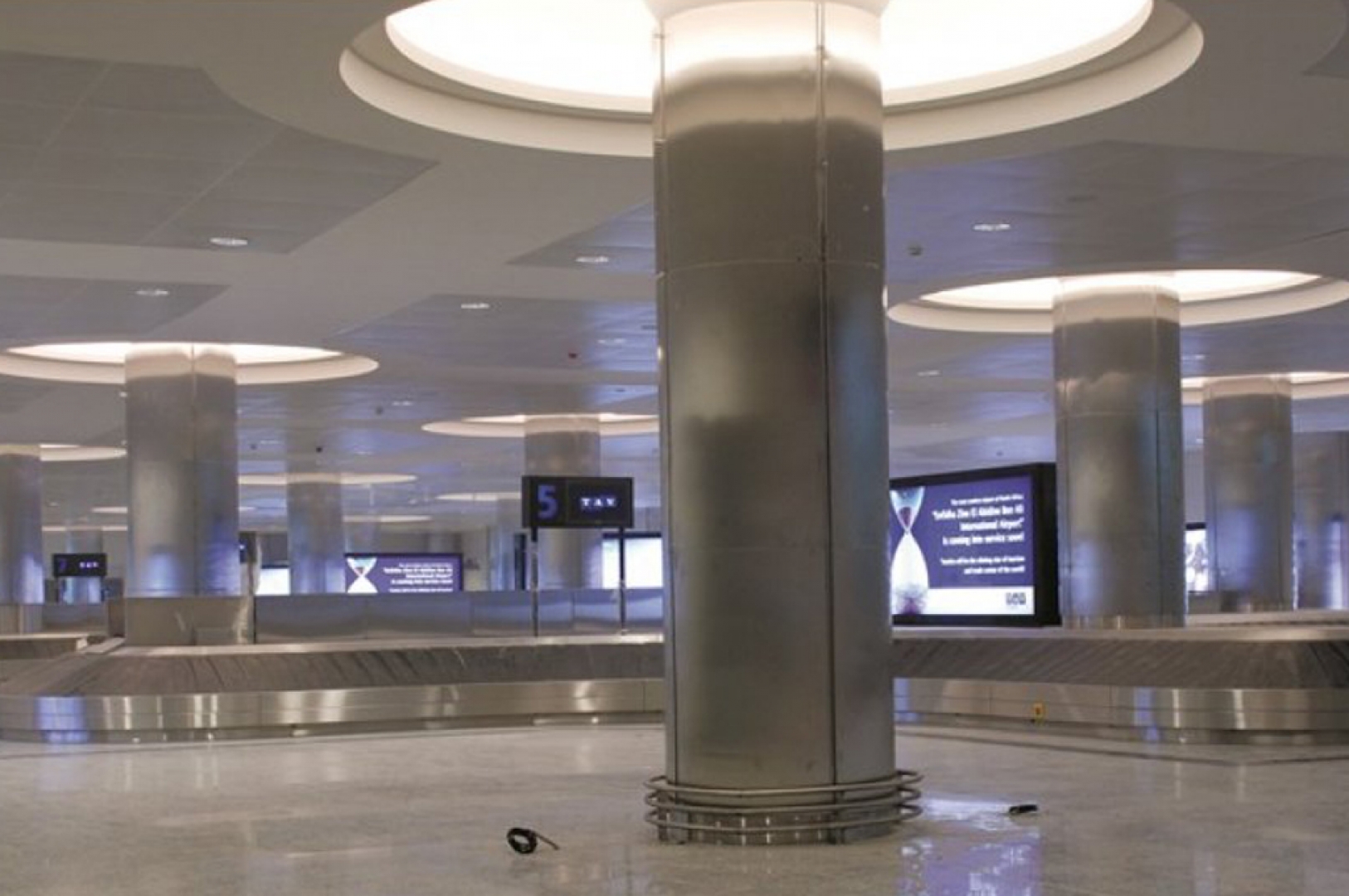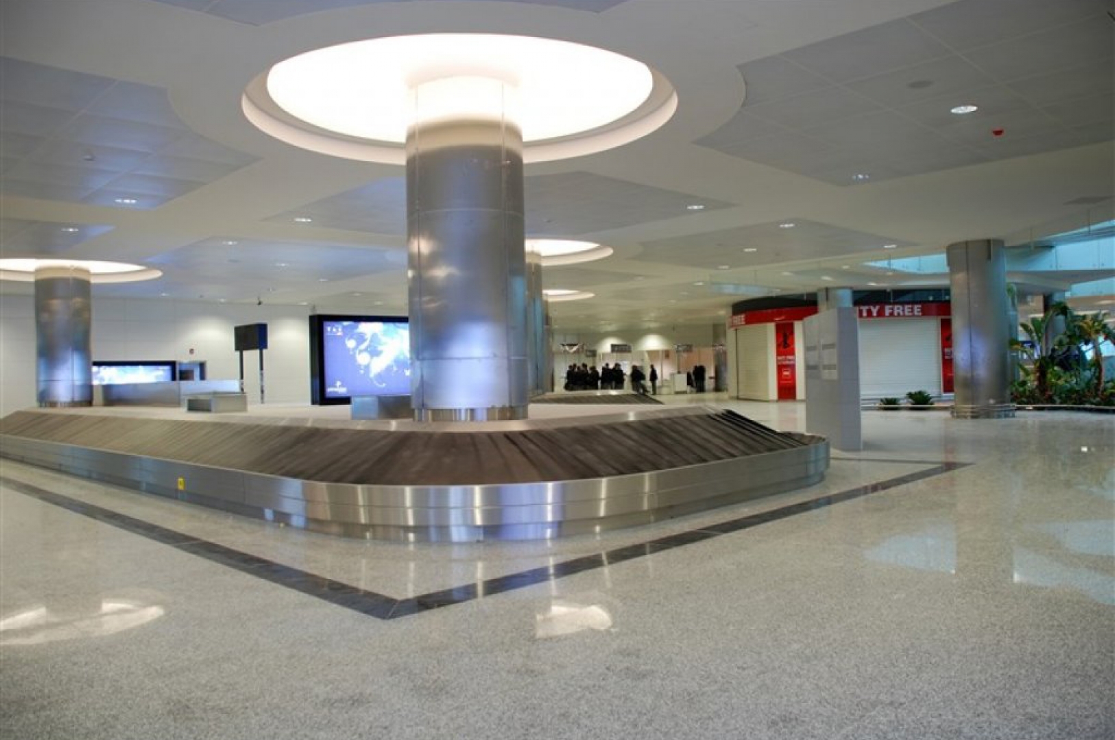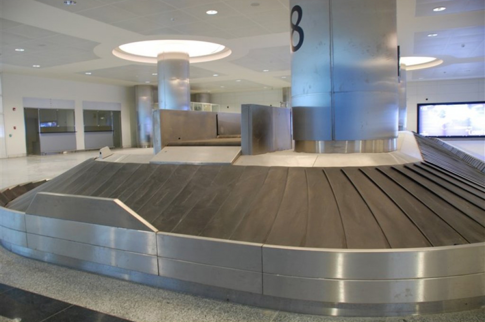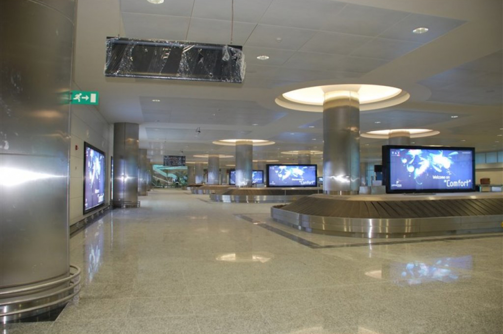 ▷ Stainless steel claddings surrounding baggage conveyor systems.