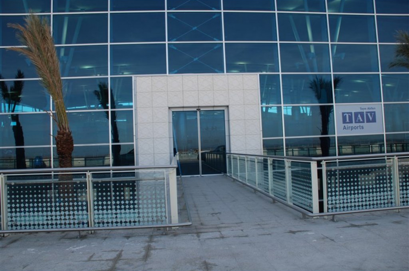 ▷ Stainless steel railings with flat bar posts for the control tower exterior terrace.