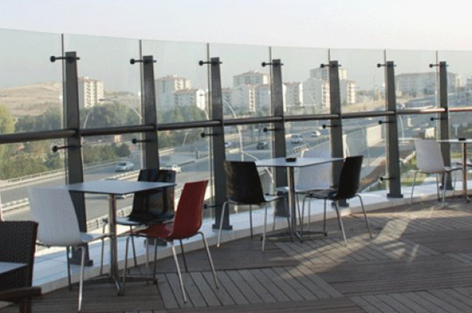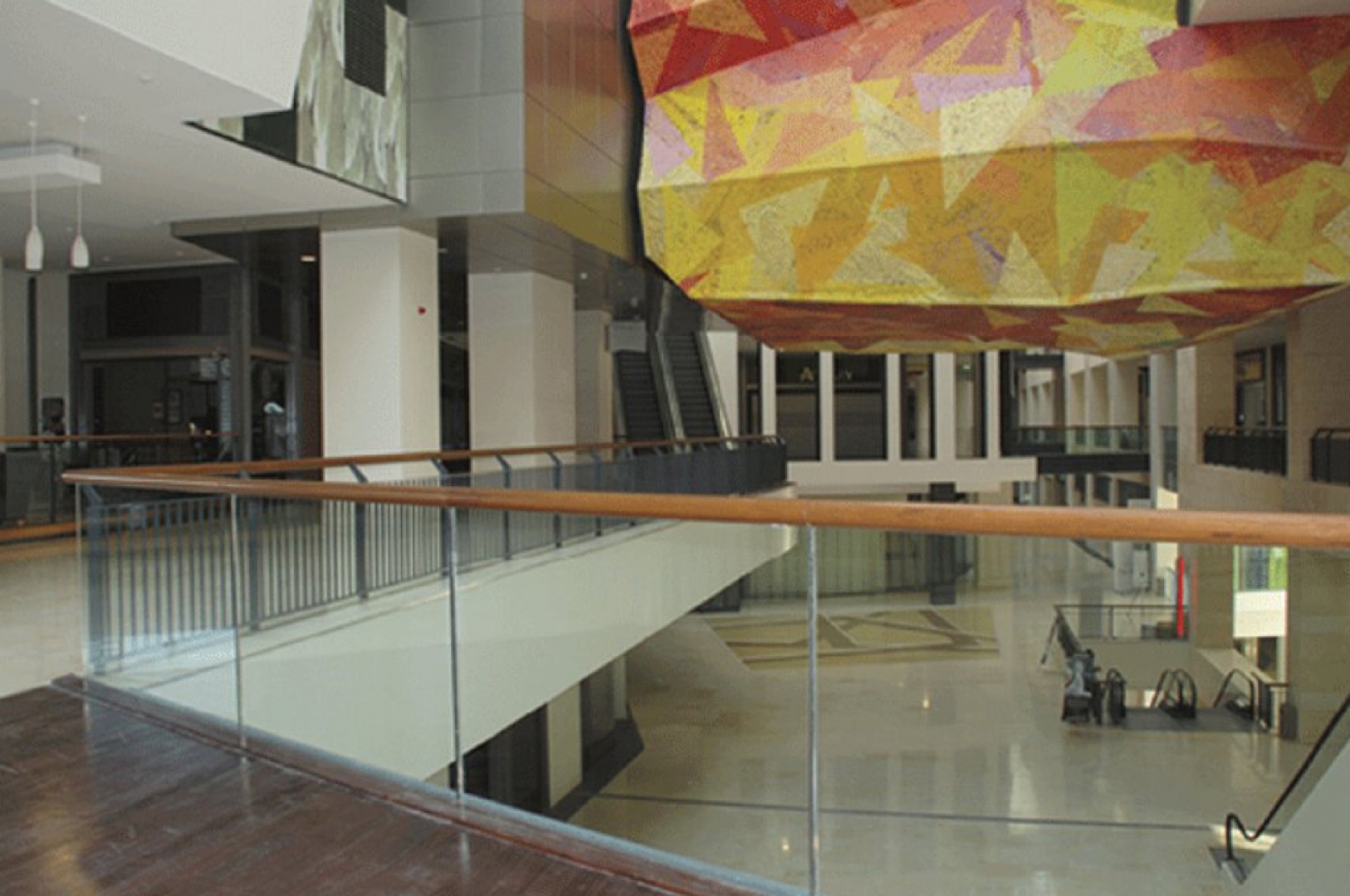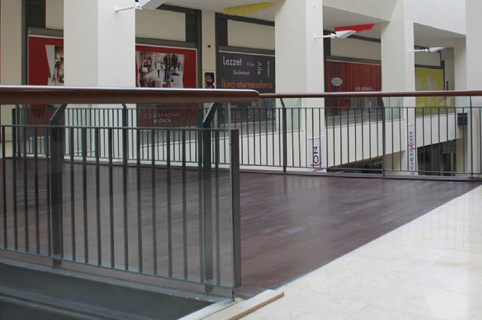 – Gordion alışveriş merkezinde iç cephesinde ahşap küpeşteli cam galeri korkulukları.