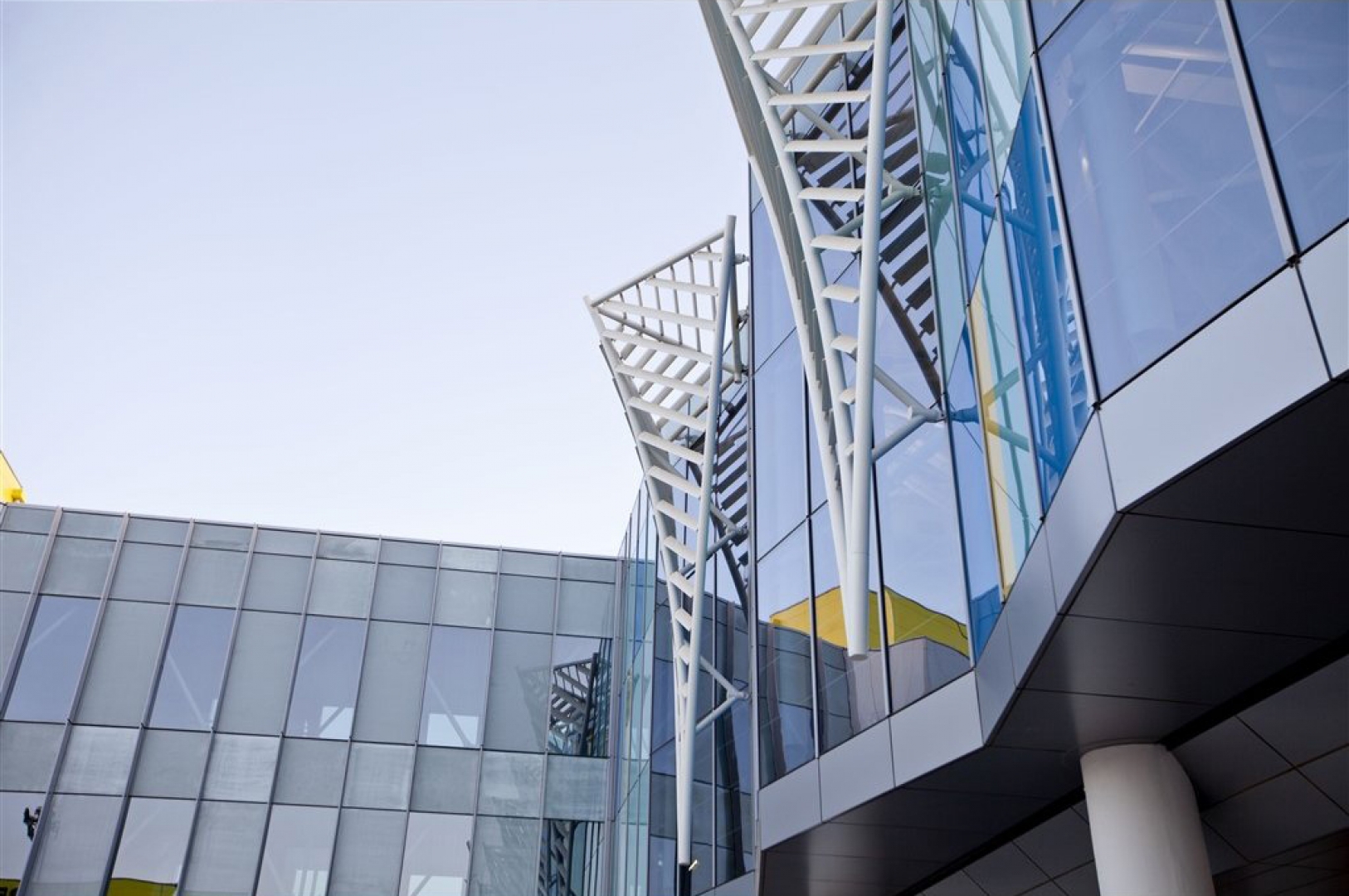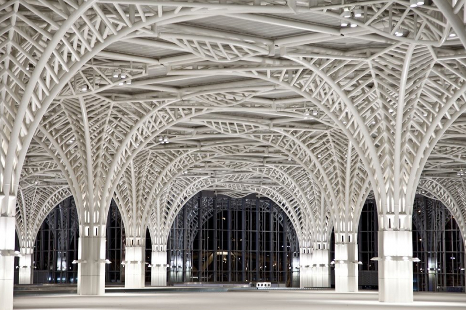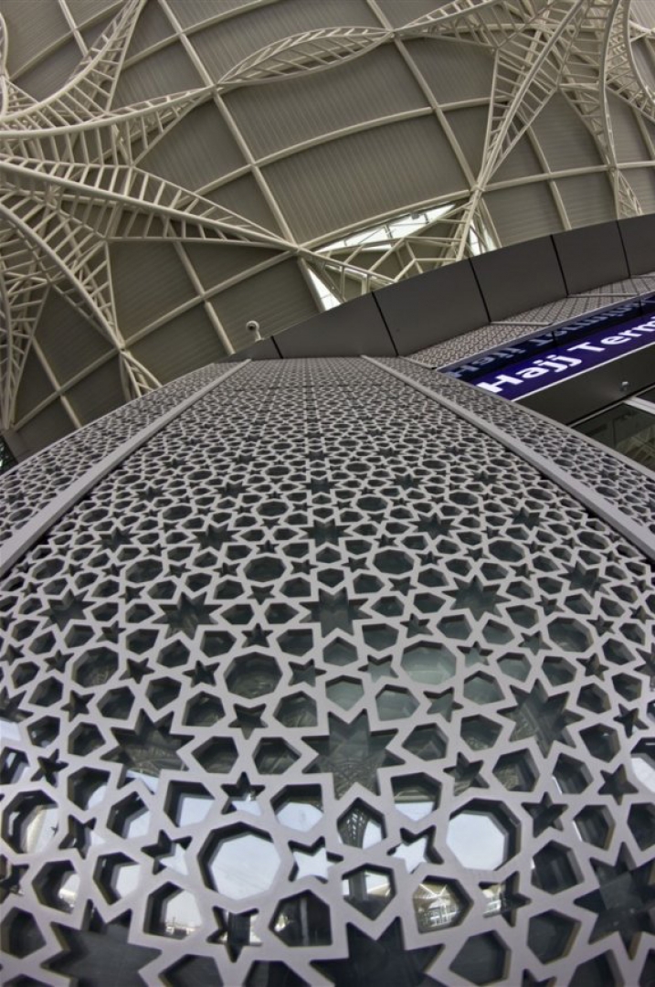 ▷ Glass cladding with Islamic pattern at X-ray entrances.